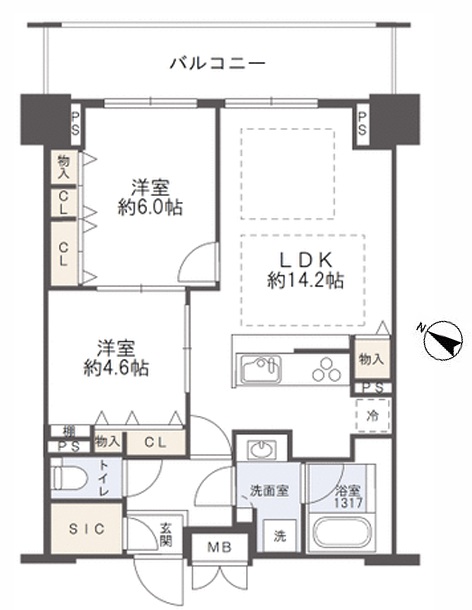 | 間取り詳細 | LDK 約14.2帖、洋室 約4.6帖、洋室 約6.0帖 | ||||