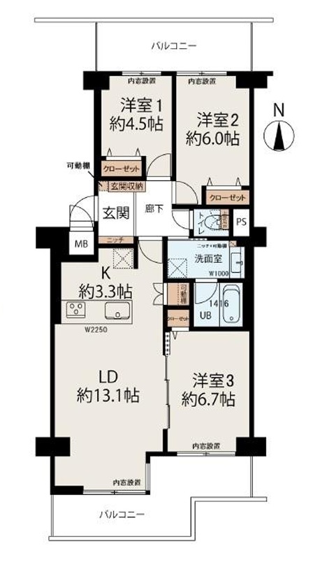 | 間取り詳細 | LDK 約13.1帖、洋室 約6.7帖、洋室 約4.5、洋室 約6.0帖 | ||||