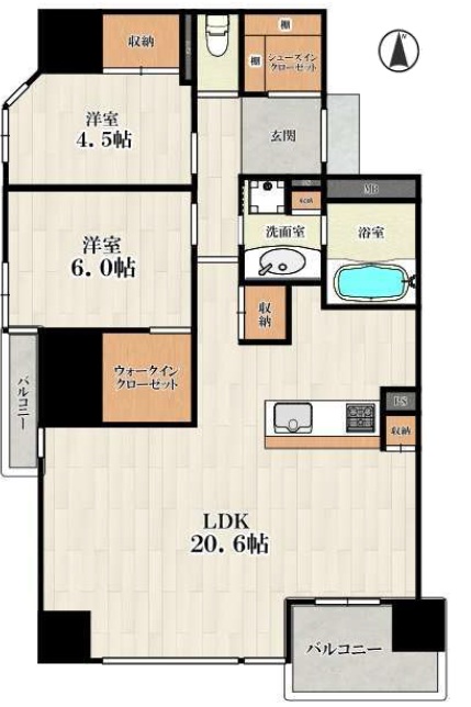 | 間取り詳細 | LDK 約20.6帖、洋室 約6.0帖、洋室 約4.5帖、WIC、SIC | ||||