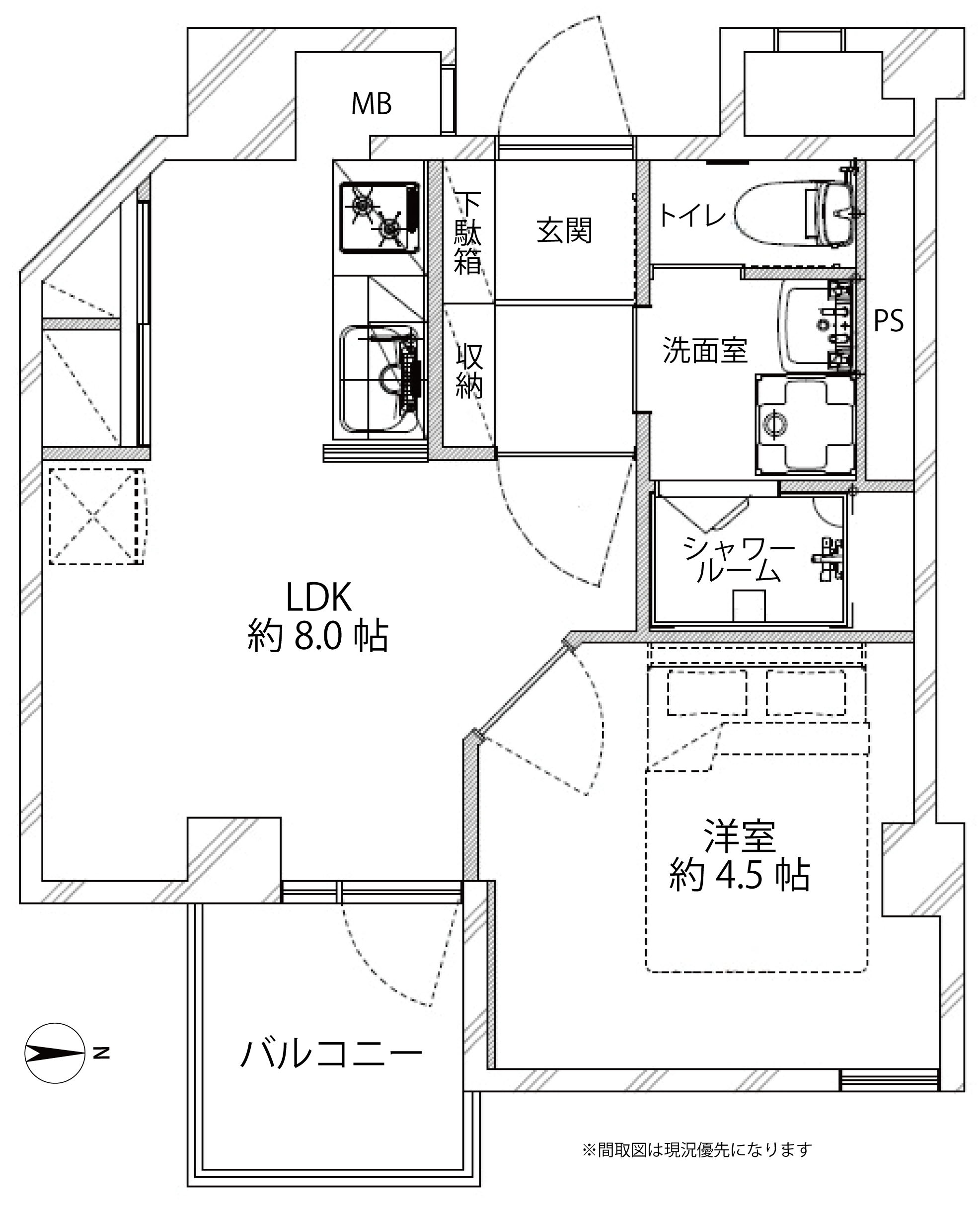 | 間取り詳細 | LDK約8帖、洋約4.5帖 | ||||