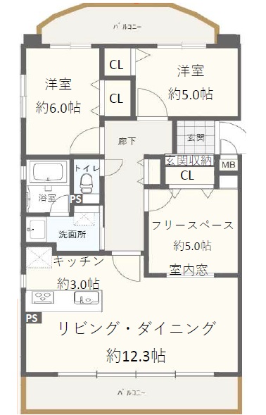 | 間取り詳細 | LDK 約12.3帖、洋室 約6.0帖、洋室 約5.0帖、フリースペース 約5.0帖 | ||||