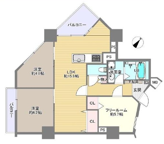 | 間取り詳細 | LDK 約15.8帖、洋室 約4.8帖、洋室 約6.2帖、フリールーム 約5.7帖 | ||||