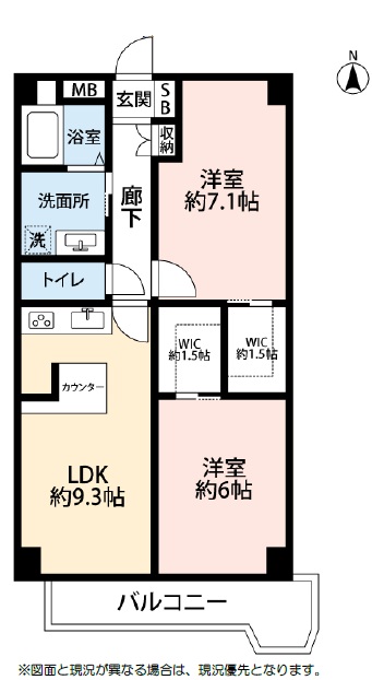 | 間取り詳細 | LDK 約9.3帖、洋室 約6.0帖、洋室 約71帖、ウォークインクローゼット | ||||