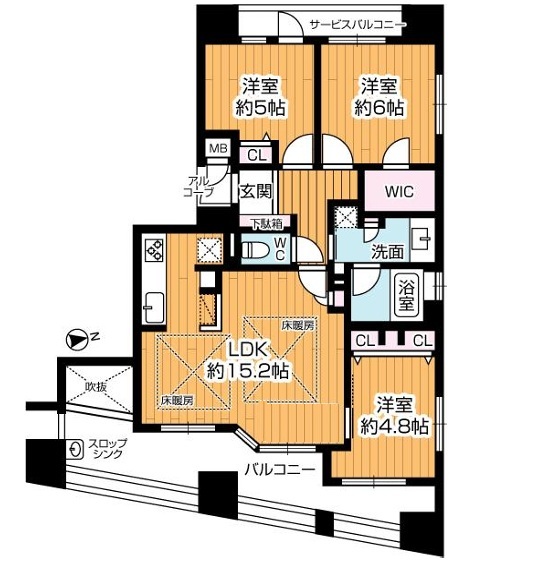 間取り詳細 | LDK 約15.2帖、洋室 約4.8帖、洋室 約5.0帖、洋室 約6.0帖、ウォークインクローゼット | ||||