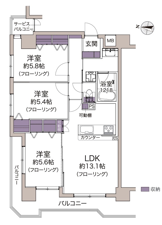 | 間取り詳細 | LDK 約13.1帖、洋室 約5.6帖、洋室 約5.4帖、洋室 約5.8帖 | ||||